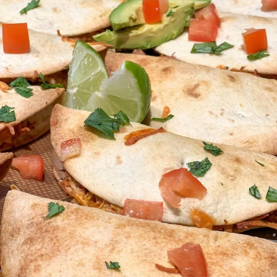 Remove the tortillas from the oven. On one half of the tortilla add 1 tbsp. of refried beans followed by ¼ cup shredded chicken mix, followed by ½ oz. of shredded cheese. Fold the other half of the tortilla over the side with the food goodies.