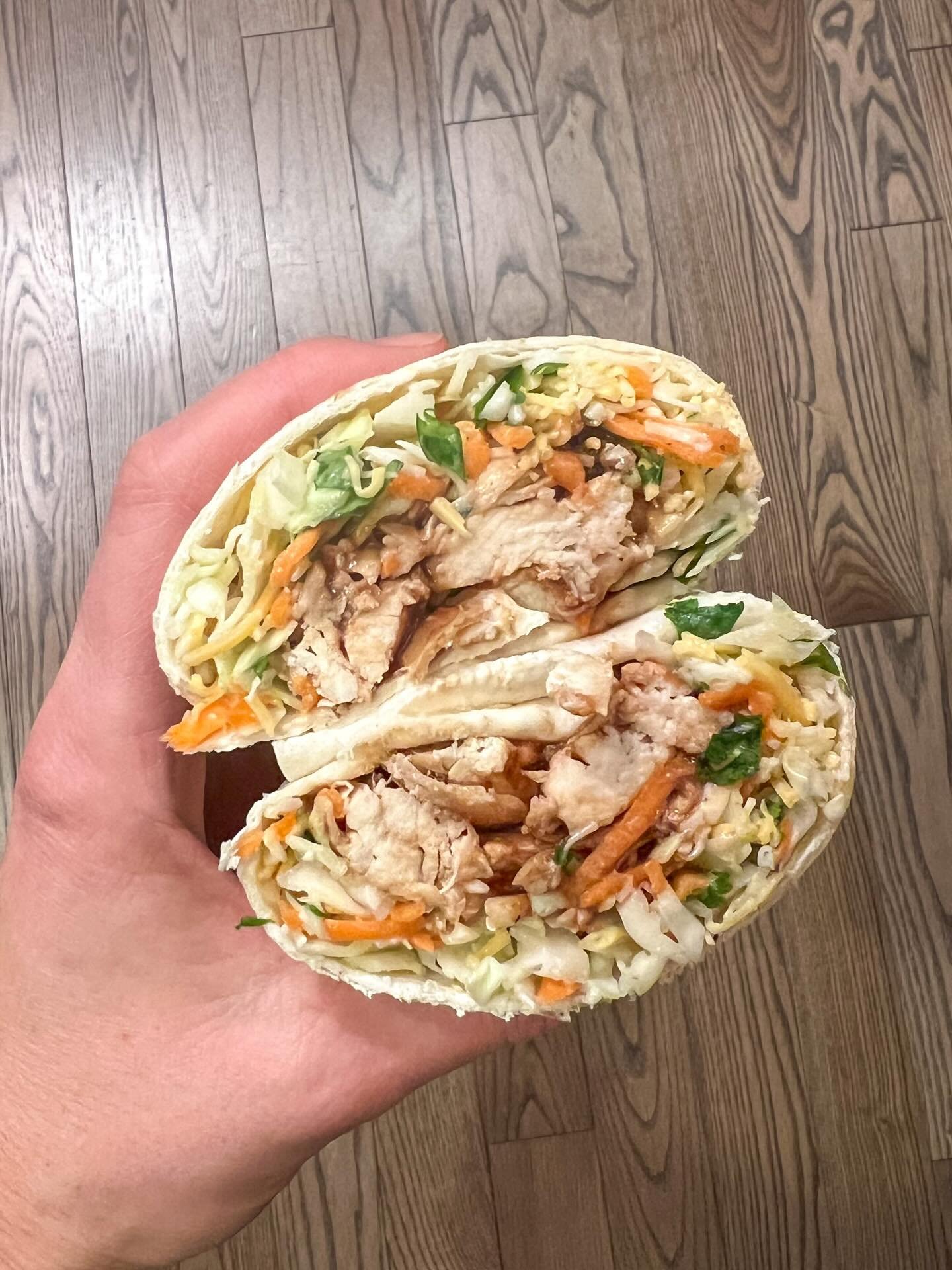 Toss the chicken with the BBQ sauce. Lay the wrap out flat on the counter.