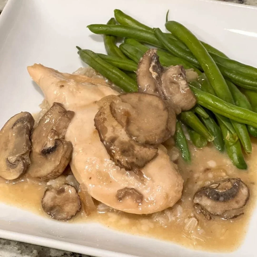Pour cream of mushroom soup mixture over the chicken and mushrooms. Give it a stir.