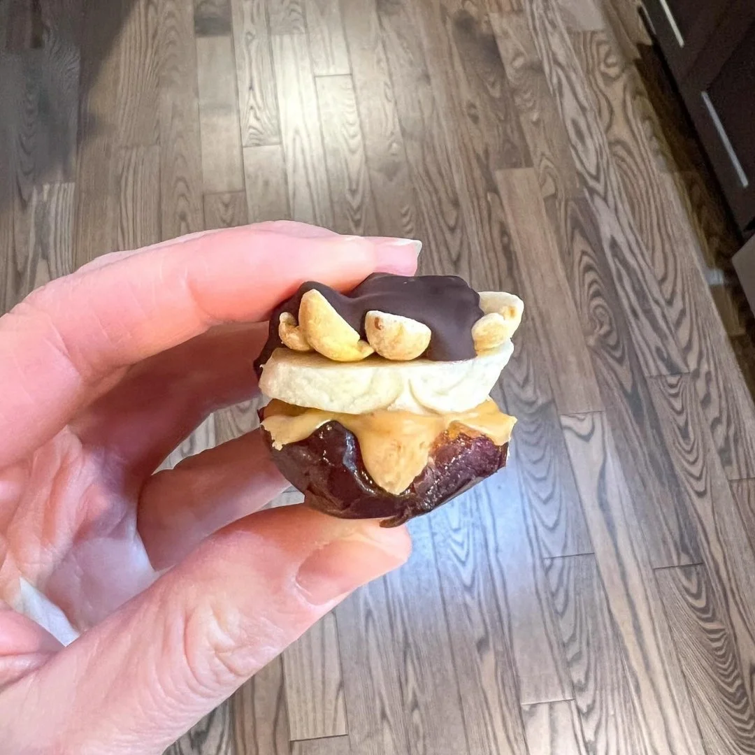 Layer 1 teaspoon of peanut butter on top of each date, then a slice of banana, then a few peanuts and then top with melted chocolate.
