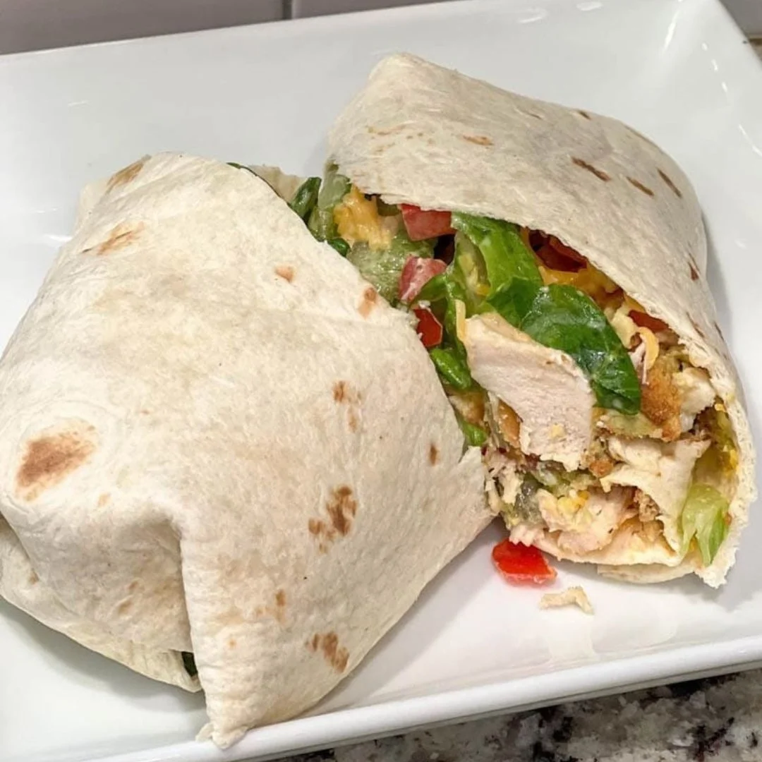 Assemble the wrap; take ½ of the chicken salad mixture and add it to wrap filling the center but leaving some space at the ends. Add ½ slices of avocado fries to the wrap. Fold the left and right sides into the middle of the wrap, overlapping them slightly. Fold up the bottom edge over the filling, then tuck it under and roll up the wrap from the bottom to the top. Roll snugly and keep the sides tucked in.