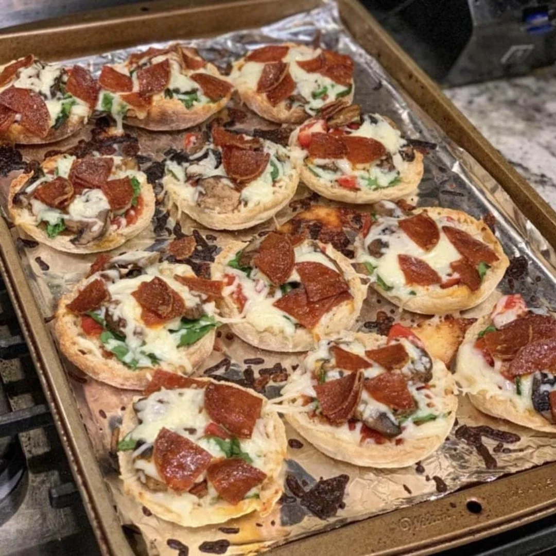 To Freeze: This is the best method for making your English Muffin Pizza ahead. Toast your English muffin halves as directed and top as desired. Lay the English Muffin Pizzas topping side up on a parchment lined baking sheet and place in the freezer for at least 2 hours. Once completely frozen, place the pizzas in a freezer safe container, separating layers of English Muffin Pizzas with parchment paper.