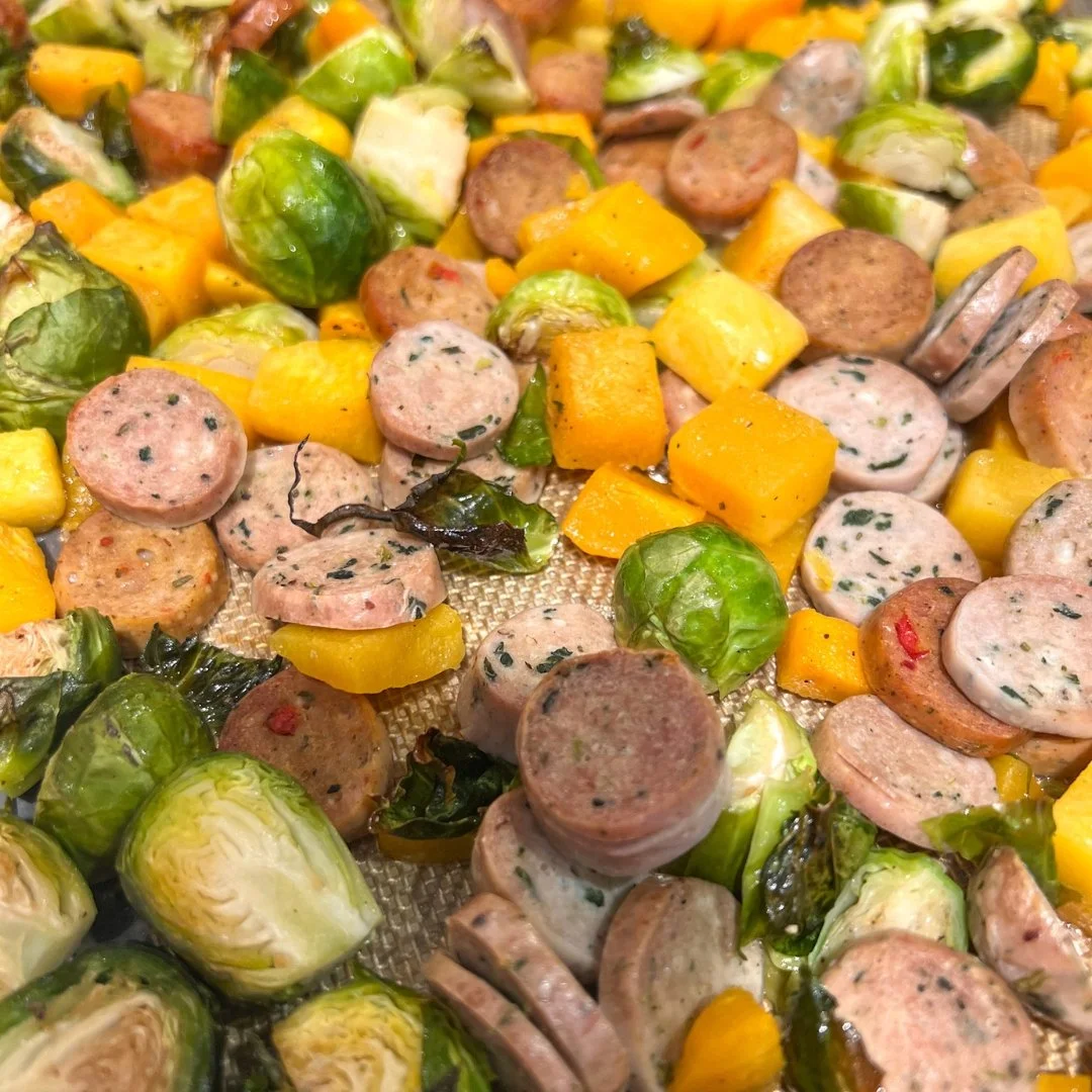 - Add chicken sausage to pan and bake at 400 degrees for 15-20 minutes. Toss and then add back to oven for another 15-20 minutes.