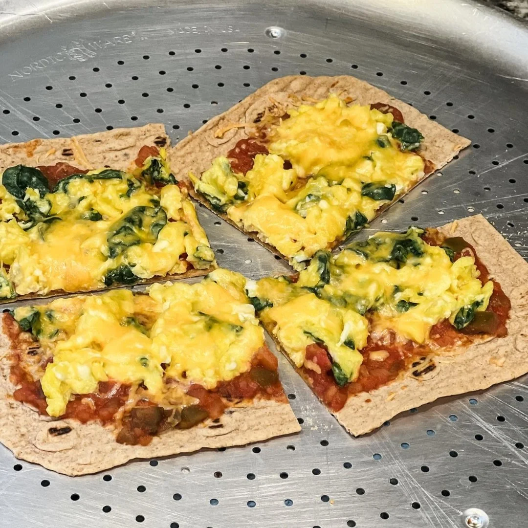 - Remove the wrap and top with the salsa (spread it out as evenly as you can) then top with the spinach eggs. Top with remaining 2 tbsp cheese.