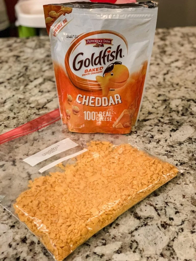 Place the goldfish in a freezer bag and then seal. Crush the goldfish in the freezer bag. Set aside.