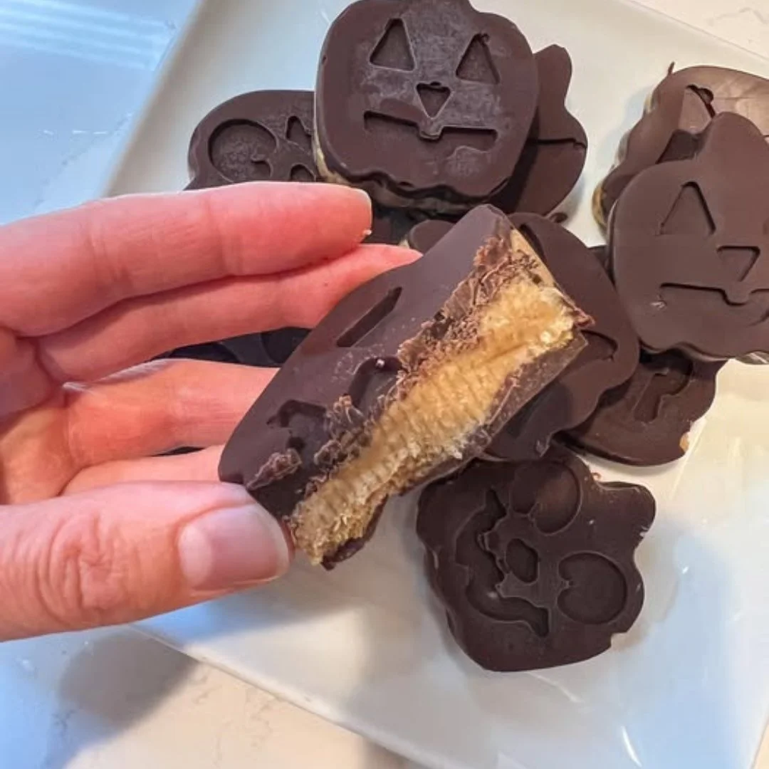 Melt 1/2 cup chocolate in a microwave safe bowl. Pour chocolate into molds. Freeze for 15-20 minutes.
