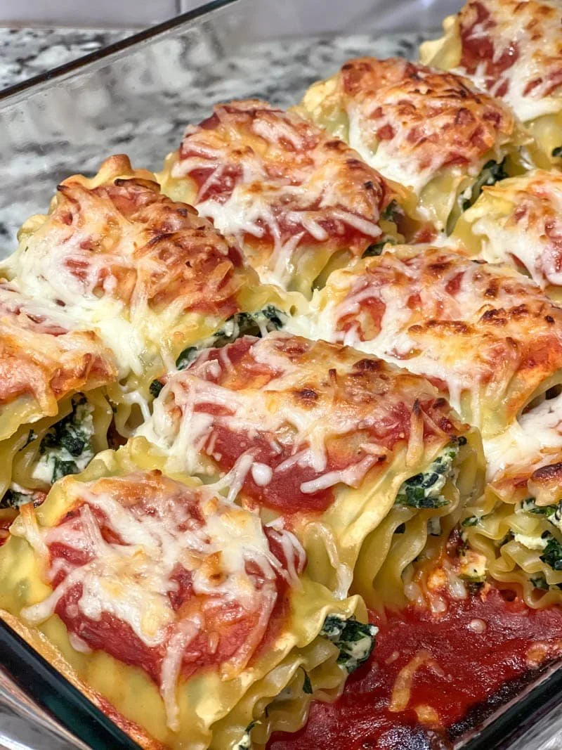 Carefully roll and place seam side down onto the baking dish. Repeat with remaining lasagna noodles and mixture.