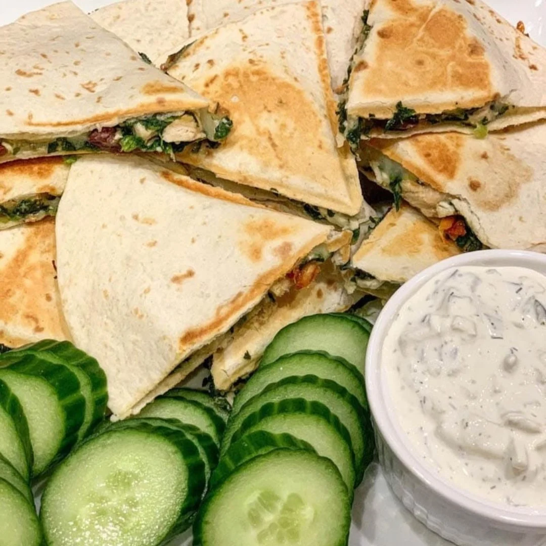 Close quesadilla maker and cook until golden brown. Repeat 3 more times. Cut into triangles and serve warm with tzatziki and sliced cucumbers.