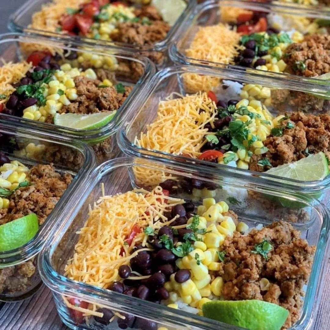 Between four meal prep containers divide the rice (½ cup each). Top the rice with taco meat, corn, black beans, tomatoes, cheese, cilantro, lime wedges (add any other desired toppings).