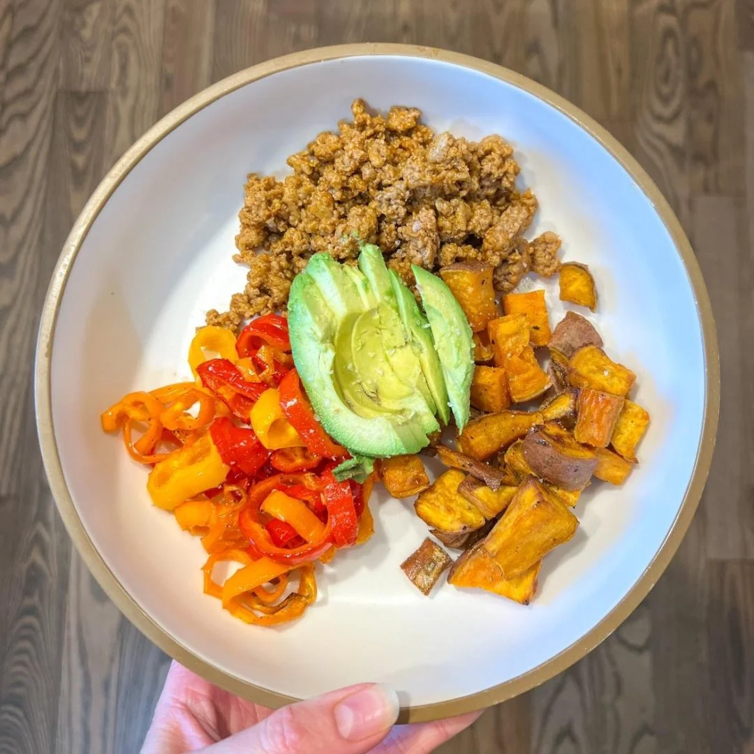 Arrange bowl, taco meat, sweet potatoes, bell peppers and 1/2 mini avocado. Great meal prep idea!