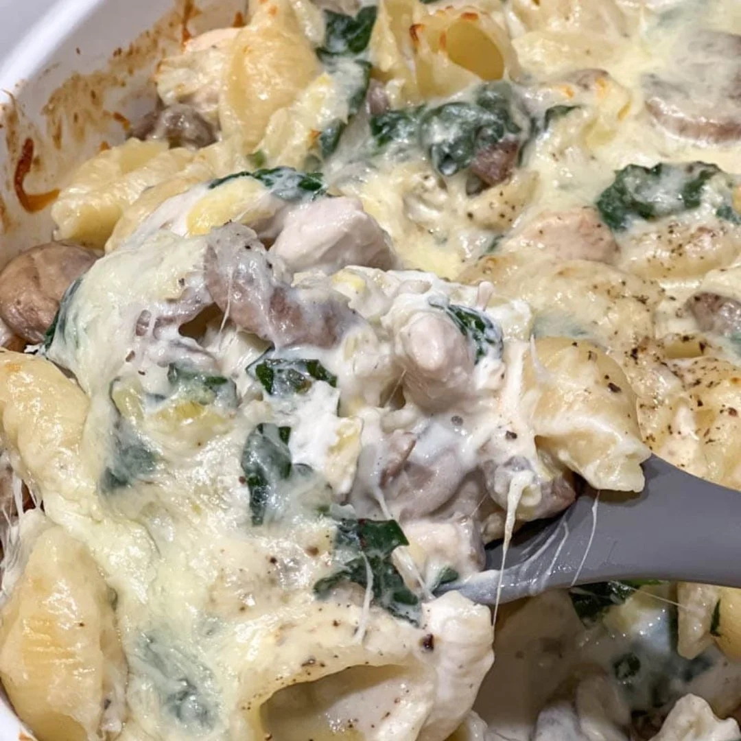 Add the cooked chicken to the baking dish with the cooked pasta, then add the spinach artichoke mixture to the baking dish with the pasta. Top with the remaining mozzarella cheese (¼ cup).