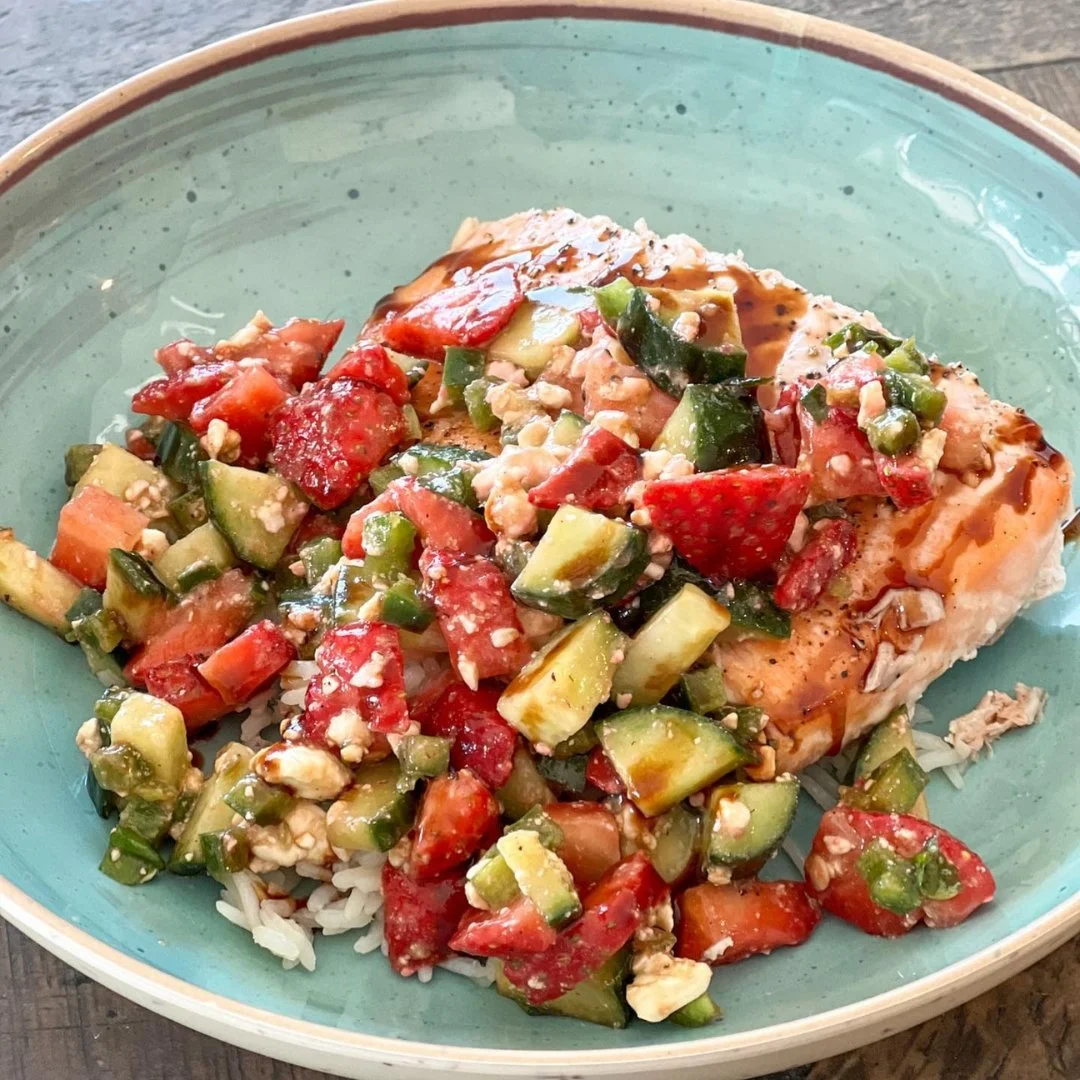 This Strawberry Salsa over Salmon is so good! It’s perfect over salmon or really any fish and would also be great over chicken!