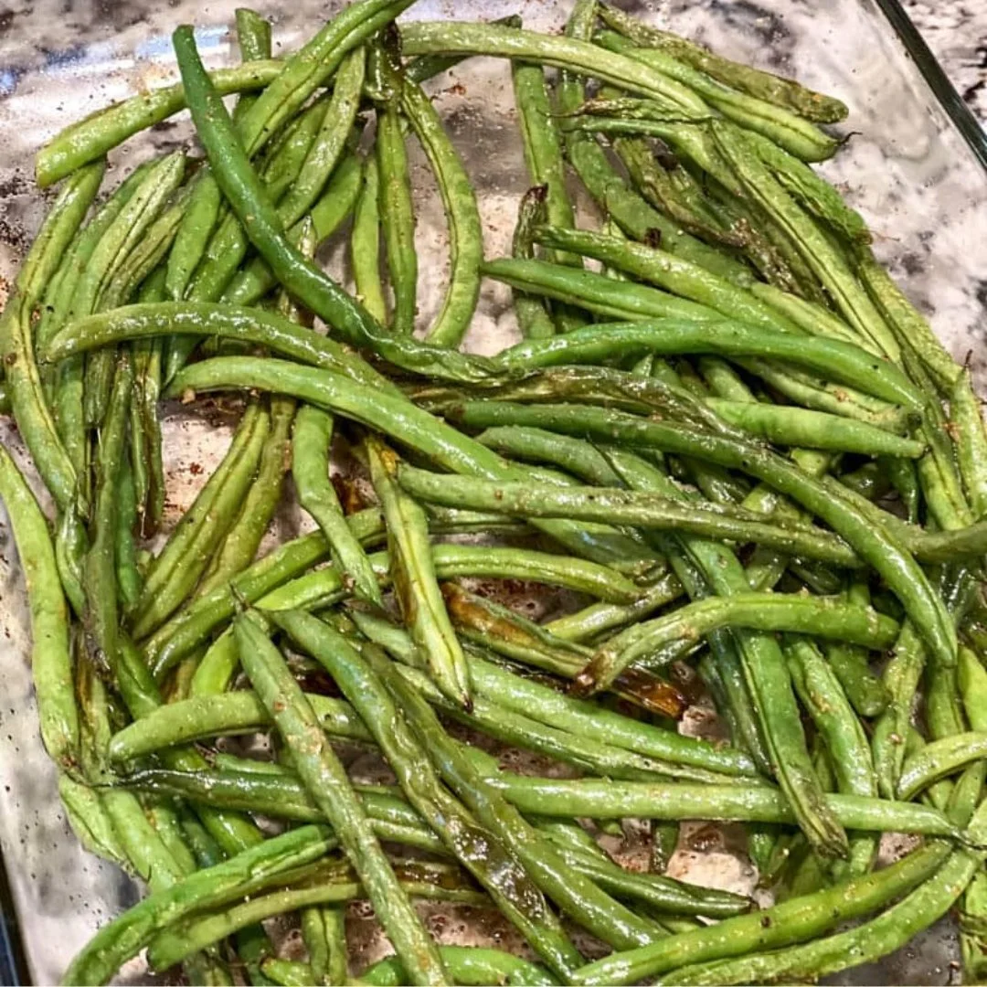 Spray a 9×13-inch pan with cooking spray. Add green beans, olive oil, garlic powder, pepper, and optional ranch seasoning or parmesan cheese.