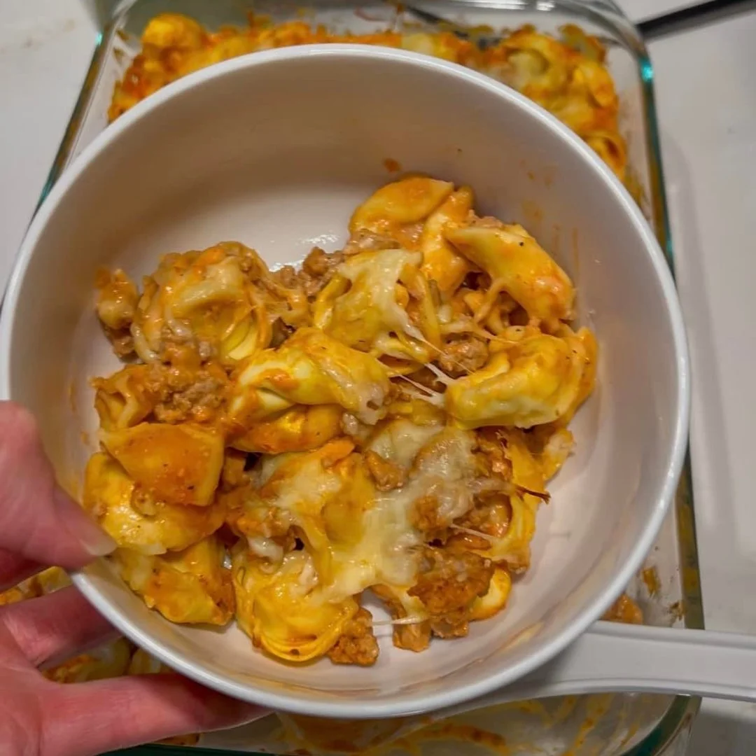 Spray a 9x13 inch pan with cooking spray. Add the tortellini and ground turkey sauce mixture. Stir until well combined.